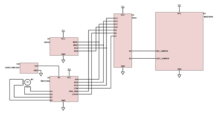 Arduino Uno: Contains the source code to manage the PN532 RFID tag reader and the TMC5130A
