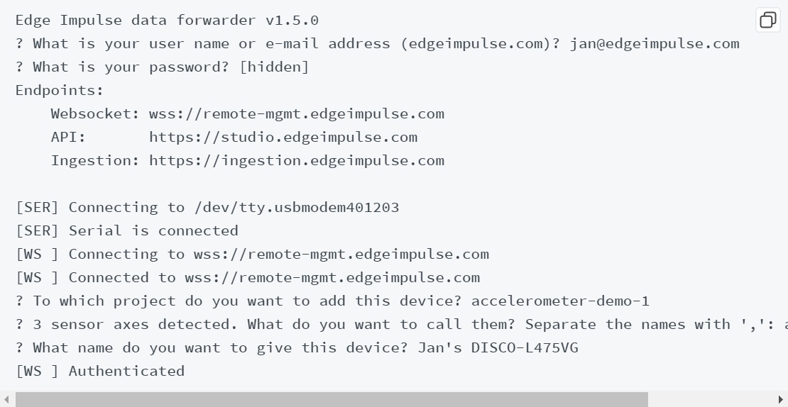 • Das zweite Tool, der Data Forwarder, wird gemeinsam mit dem Serial Daemon (Abbildung 3) verwendet. Gemeinsam ermöglichen sie es, dass ein Sensorgerät, das nicht über eine integrierte drahtlose Verbindung verfügt, über eine kabelgebundene serielle Verbindung mit Edge Impulse über einen Desktop-Computer mit Internetanschluss verbunden werden kann. Die Geräte schreiben ihre Sensordaten einfach in einem kommagetrennten oder tabulatorgetrennten Format an einen seriellen Anschluss. Die Daten werden anschließend gesammelt, kryptographisch signiert und an den Datenaufnahmedienst von Edge Impulse übermittelt. Dank der weiten Verbreitung kostengünstiger Wi-Fi®-fähiger Einplatinencomputer sorgen diese Tools für einen einfachen wie auch kostengünstigen Einstieg in Embedded-Machine-Learning. Serial Daemon und Data Forwarder sind von der Kommandozeilenschnittstelle (CLI) eines Computers aus zugänglich. Ein Nachteil ist, dass der Data Forwarder im Vergleich zur direkten Programmierung eines eingebetteten Geräts zur Verwendung der API in seiner Geschwindigkeit begrenzt ist.
