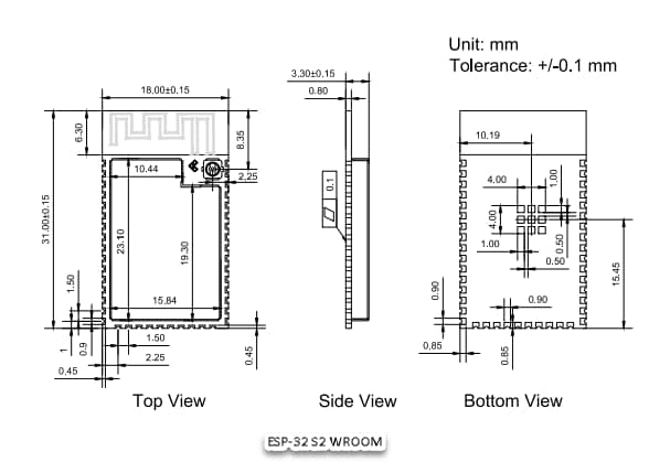 | DFR0743-WROOM | DFRobot | WLAN-Module – 802.11 ESP32-S2-WROOM Wi-Fi Module (PCB Antenna) | 3.3 V | 31 mm x 18 mm x 3.3 mm |