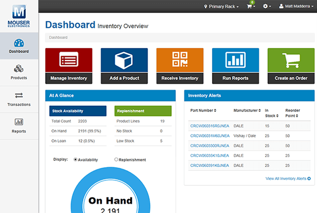 Die Lagerverwaltungs-Plattform von Mouser ist ein webbasiertes System, mit dem Unternehmen ihre Lagerbestände an elektronischen Bauteilen und Zubehör einfach verwalten und verfolgen können.