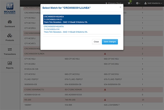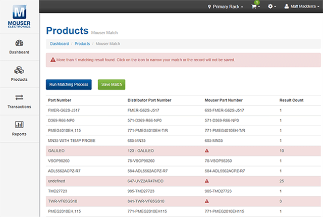 - Verknüpfung von Produkten, die sich in Ihrem Bestand befinden, mit Teilenummern von Mouser, um die Nachbestellung zu vereinfachen