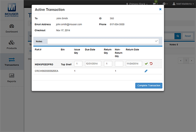 In der modalen Einblendung der Transaktionsdaten können Sie verschiedene Änderungen vornehmen. Diese Änderungen können geringfügig sein, wie zum Beispiel das Hinzufügen von Transaktionsnotizen, oder erheblich, wie die Aktualisierung der Ausgabemenge oder die Fälligkeitstermine für die Rückgabe. Sie können eine aktive Transaktion auch als abgeschlossen markieren, indem Sie beliebige Rückgabemengen und den Rückgabetermin angeben und auf die Schaltfläche „Transaktion abschließen“ klicken.